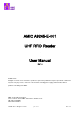 AMIC A9245-E-001 UHF RFID Reader User Manual Rev 1.4 © AMIC 2010 All rights reserved. Unless otherwise specified, no part of this publication may be reproduced or utilized in any form or by any means, electronic or mechanical, including photocopying and microfilm, without permission in writing from AMIC. AMIC Technology Corporation. th No.2, Li-Hsin 6 Road, SBIP, 300 Hsinchu, Taiwan, R.O.C TEL: 886-3-5679966 FAX: 886-3-5679977 © AMIC 2010 – All rights reserved p1 of 17 Rev 1.