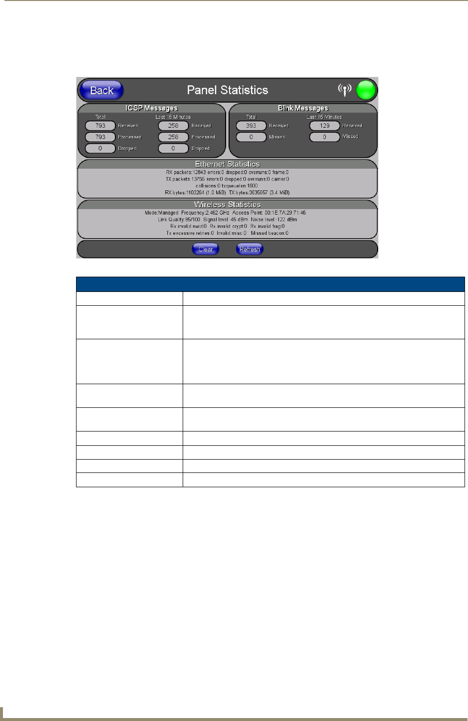 The Panel Statistics page (FIG. 62) displays activity between the device and the network in proportions of