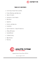- TABLE OF CONTENTS • Front Cover, Product Photo and Title • Product Warnings and Advisories • Table of Contents • Introduction / Box Contents • Main Parts • Operation • Controls and Indicators • Installation • Input Connections / Output Connections • Offline UPS Option • InverterWizard • Troubleshooting • Specifications • Warranty Copyright Analytic Systems Ware (1993) Ltd.