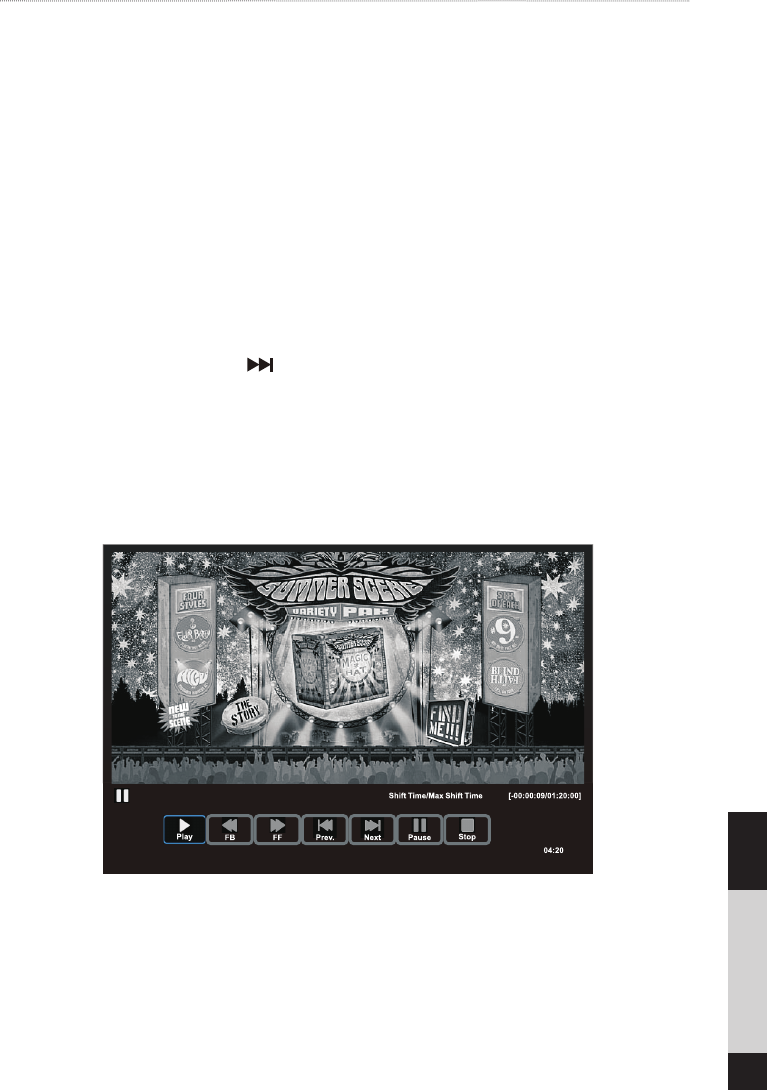 When you have returned, press the button to play the missed broadcast programme. “||” will