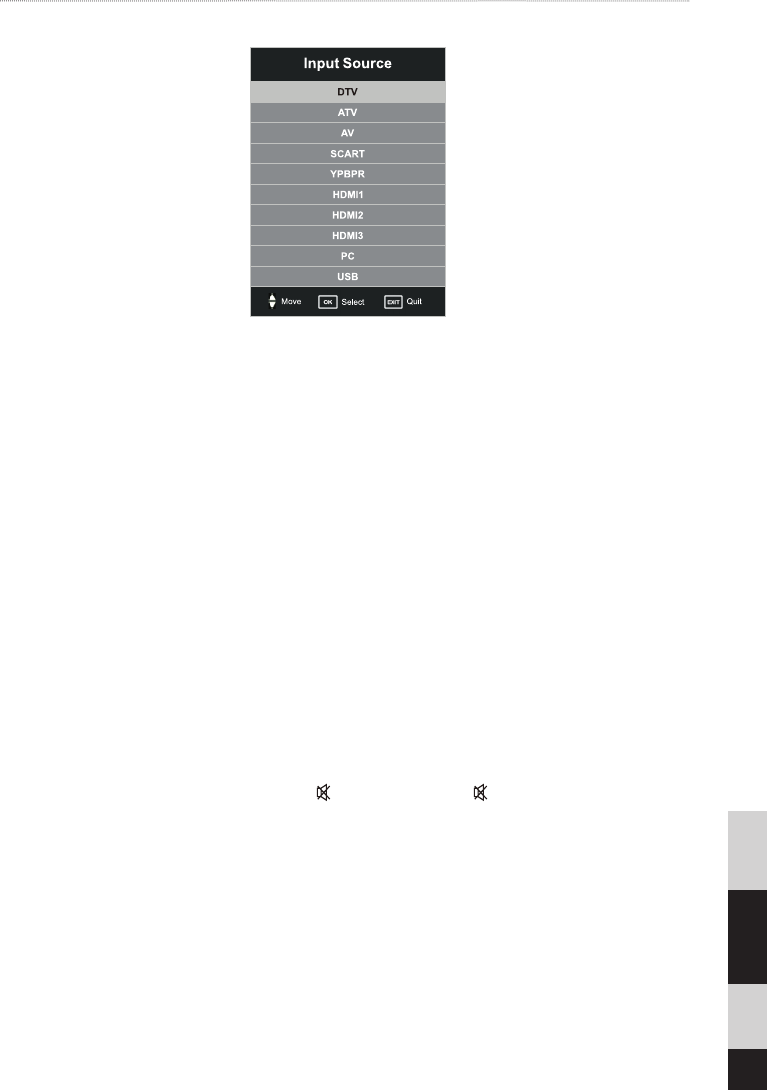 2. Tryck på / knapparna för att välja den källa som du vill visa: DTV / ATV / AV / SCART / YPBPR /