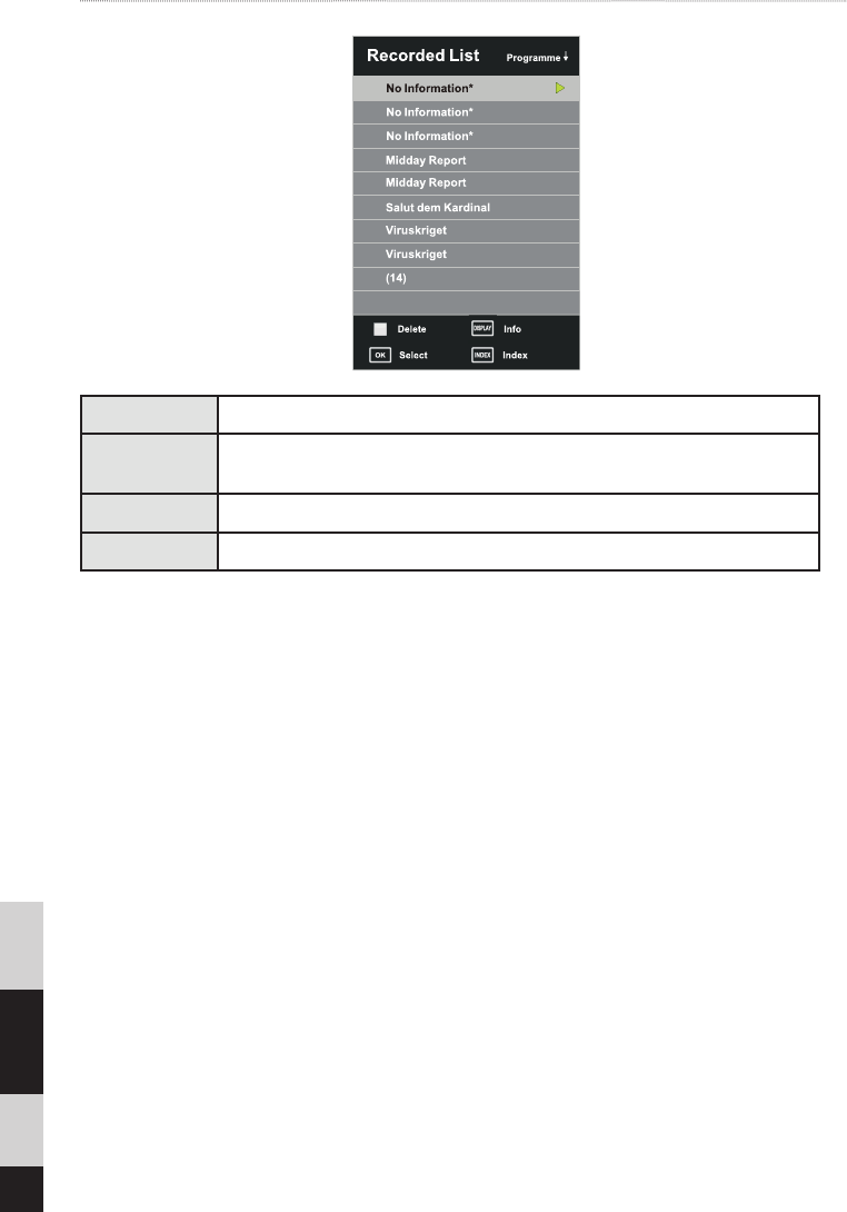 Index Tryck på INDEX-knappen för att välja kategorityp: Program / kanal / tid.