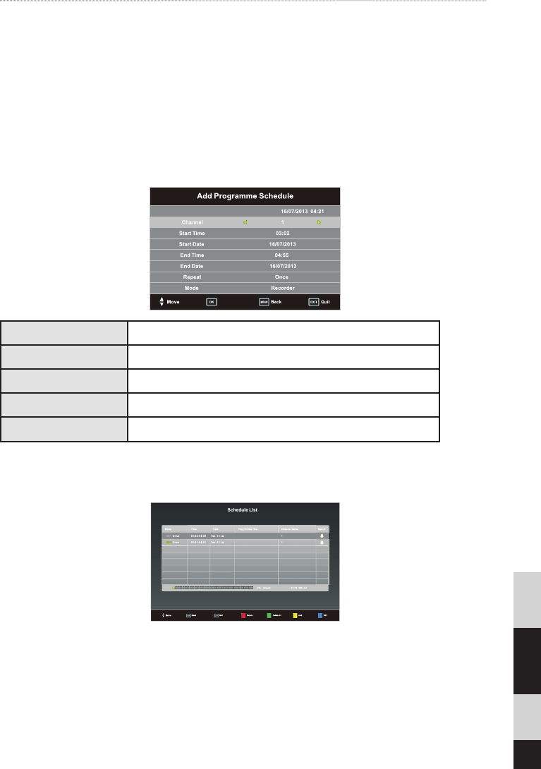 3. Menyn för “Programme Schedule” visas. Använd -knapparna för att göra inställningar och