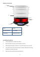 Appliance components A. B. F. C. D. E. A. Lid D. Base B. Lower container E. LCD display C. Reservoir F. Water entry tray Assembling the appliance 1. Use the appliance on a flat level surface. 2. Place the water entry tray onto the water reservoir. 3. Always place the lower container on top of the water entry tray first. 4. If you wish to use more than the lower container, place the remaining containers on top in size order. 5. Place the lid on top of the last used container.