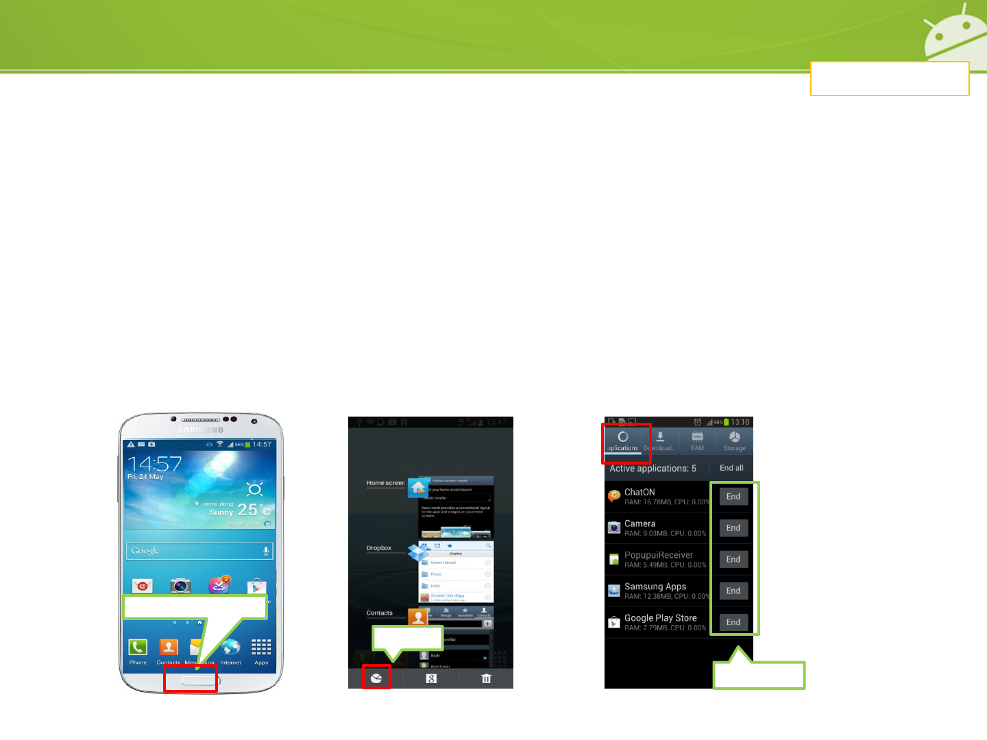 1) When you close an application using the HOME key and not the back key, the application may still be working and