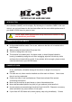 HZ-350 感謝您選用安特利 HZ-350 特效煙霧機,此機型為一堅固耐用並擁有細緻輸出的特效煙霧機 系列。使用之前,我們建議您先仔細閱讀此說明書,依照使用說明書中的說明來使用可使您 在使用 HZ-350 時既安全又可達到最滿意煙霧效果,另也可使機器的使用壽命更為延長。 避免觸電的安全使用方式 請保持機器乾燥。 使用前請小心判定電壓及伏特數,所有機種並應配合接地型插座使用。 填充煙霧油前,請務必先拔掉插頭。 不使用時請關機, 或請拔掉電源插頭。 本產品非防水設計,遇潮濕、浸水或煙霧油滲入時請即刻拔掉插頭、以乾布擦拭乾淨然後 靜置。若再次使用時有任何問題請與您的技術人員或安特利經銷商聯絡。 避免燃燒的安全使用方式 機器內部並無一般使用者可變動之結構,請勿任意打開上蓋及作任何修改動作,否則可能 造成起火的危險! 機器僅限成人使用,安裝煙霧機之地點應避免兒童可觸及之處,請勿於無人看顧的情況下 使用。 請將煙霧機放置於通風良好的地方,為確保良好通風,機器的上方及周圍請務必預留 20 公分的空間。 請勿將機器對準火焰或靠近易燃物。 請勿將