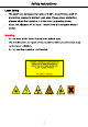 Safety Instructions It is normal that a small flame appears when a laser beam irradiates the material. The flame should follow the laser and disappear while the laser travel forward. If a flame keeps burning on material: ® Turn off the machine and pull the plug. @ Put out the fire with a wet towel or a fire extinguisher when it is necessary. @ If the fire cannot be extinguished or spreads out of the machine, please call local emergency number (e.g. 998) and evacuate from the buildings.