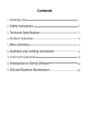 Contents Packing List 1 Safety instructions 2 Technical Specification 3 Product Overview 4 Menu Directory 5 Assembly and Leveling Instructions =e 8 First Print Instructions 14 introductions Slicing Software 16 ~FAQ-and-Machine Maintenance 50