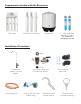 Components included with the Ro system: 1 RO system 3 Pre-filters in 3 Housings 1 Storage tank 2 - 4 RO membranes (depends on model) Pre inserted in membrane housing Installation Kit includes 1 Faucet with washers, nuts and adapter Color tubings 3/8” 1 Feed water adaptor with feed water ball valve kit 1 Tank shut-off valve with adaptor fitting 1 Wrench to open 3 pre-filter housing 1 1 Drain saddle for waste water 1 Wrench to open membrane housings