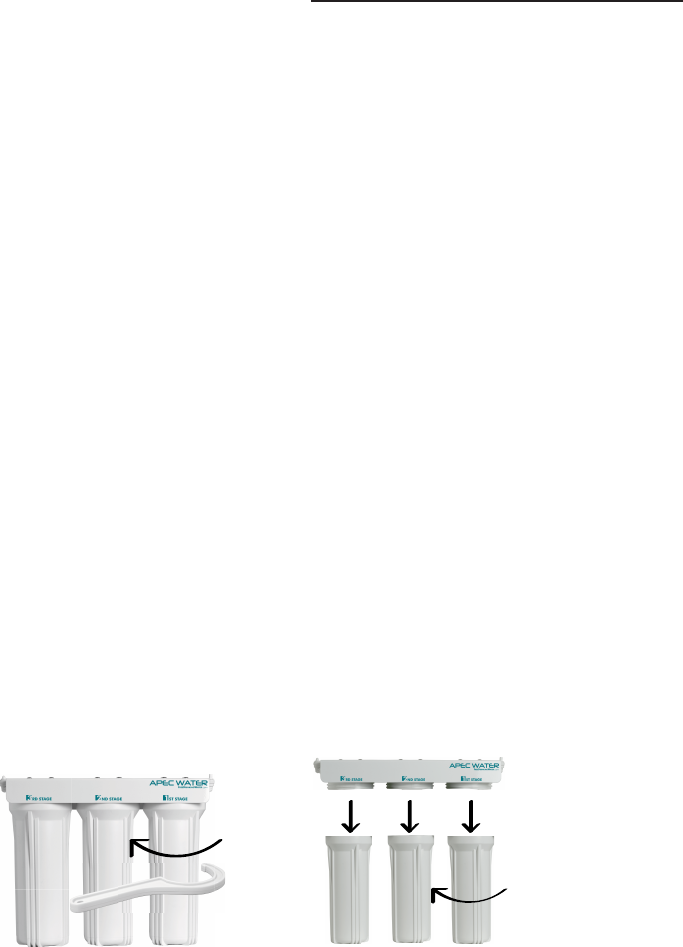 3) Discard 3 used filters, wash housings with mild soap, rinse off. Put 3 new filters into their respec-