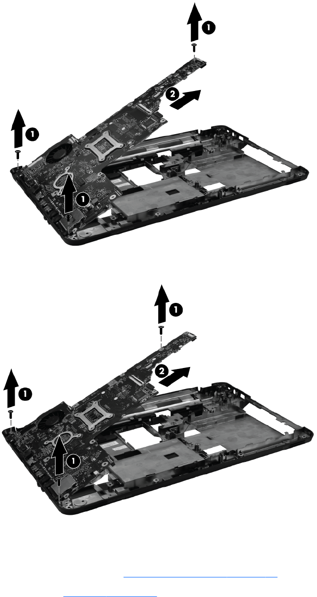 Lift the system board (2) from the right edge and pull it away from the base enclosure at an angle.
