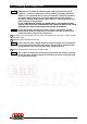 5 Testing & Troubleshooting 5.4 Post-Installation Check List Now that the compressor installation has been completed, ARB recommends that you take the time to complete the following check list just to insure that you haven’t missed any of the vital steps. The air system has been leak tested. The air filter position will not be exposed to moisture, dust or dirt. All air lines and wiring have been securely cable tied to resist snagging.