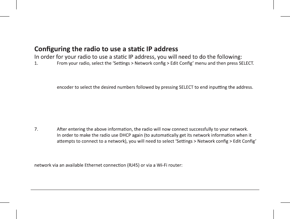 2. The radio will now display ‘Auto (DHCP)? YES / NO’. Turn the radio’s rotary encoder to select ‘NO’