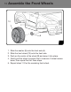 Assemble the Front Wheels 10 A 9 B 1. 2. 3. 4. 1 Slide the washer (9) onto the front axle (A). Slide the front wheel (10) onto the front axle. Push on the center of the wheel (B) and snap it into place. Gently pull the wheel to ensure that it is secure. If wheel comes loose, then repeat the first three steps. 5. Repeat steps 1-3 for the remaining front wheel.