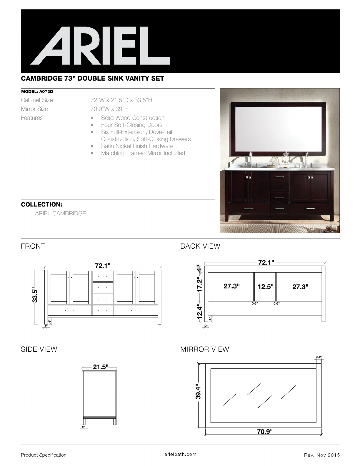 Cambridge 73 in. Vanity in Espresso with Marble Vanity Top in Carrara White, Under-Mount Basins and Mirror