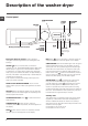 Description of the washer-dryer GB Control panel TEMPERATURE CHILD LOCK button button ON/OFF CLEANING ACTION button button DISPLAY START/PAUSE Detergent dispenser drawer WASH CYCLE SELECTOR KNOB button and indicator light SPIN button OPTION buttons and indicator lights DRY button Detergent dispenser drawer: used to dispense detergents and washing additives (see “Detergents and laundry”). ON/OFF button: press this briefly to switch the machine on or off.