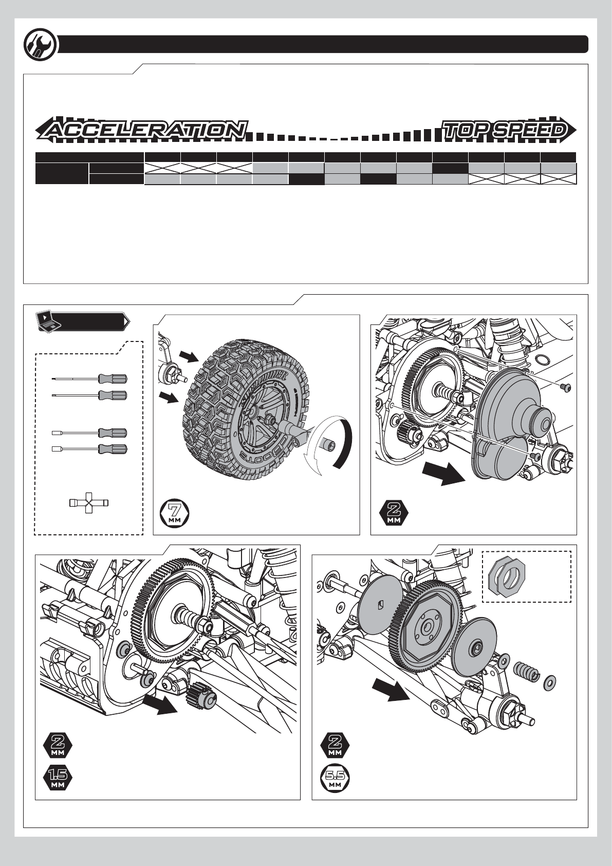 Upgraded motors/ESCs and non-standard wheels may require different gear ratios. Try to find the best balance between speed/