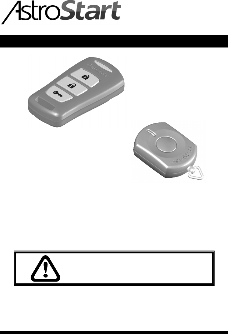 SAFETY PRECAUTIONS Before using this product, carefully read the following safety precautions. GENERAL RULES • Never perform a remote start when a person or animal is inside the vehicle. • Do not allow any person or animal to remain inside the vehicle when the engine is running under remote starter control (continuous mode). • Immediately report any malfunction to the AstroStart dealer that performed the installation. • Under no circumstance can this product or its use be modified.
