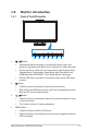 1.5 Monitor introduction 1.5.1 Front of the LED monitor 1 1. 3 4 5 6 7 Button: • Automatically adjust the image to its optimized position, clock, and phase by long pressing this button for 2-4 seconds (for VGA mode only). • Use this hot key to switch from six video preset modes (Scenery Mode, Standard Mode, Theater Mode, Game Mode, Night View Mode, and sRGB Mode) with SPLENDID™ Video Enhancement Technology. • Exit the OSD menu or go back to the previous menu as the OSD menu is active. 2.