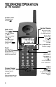 TELEPHONE HEADLINE LEFT OPERATION AT HEADLINE THE HANDSET L-SUB Answer a Call Press any key except . Make a Call Press , then dial the number — OR — Dial the number (use to backspace and correct digits), then press to call. Flash/ Call Waiting Access special telephone company subscriber services. Change Channel Switch to a clearer channel while on a call. Enter programming while not on a call. 6 Handset Volume While on a call, adjust volume of what you hear.