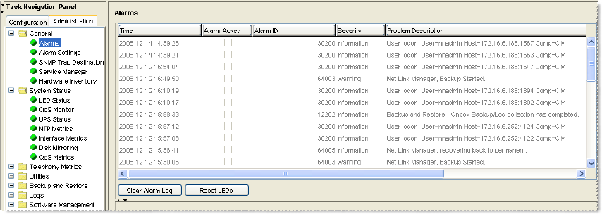 Below is an example of the BCM Alarms Panel in the BCM Element Manager:
