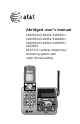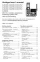 Abridged user’s manual CL82101/CL82201/CL82251/ CL82301/CL82351/CL82401/ CL82451/CL82501/CL82551/ CL82601 DECT 6.0 cordless telephone/ answering system with caller ID/call waiting For more detailed instructions, refer to the Complete user’s manual at www.telephones.att.com/manuals. Table of contents Getting started Telephone operation Quick reference guide - handset......... 1 Quick reference guide - handset & telephone base.......................................