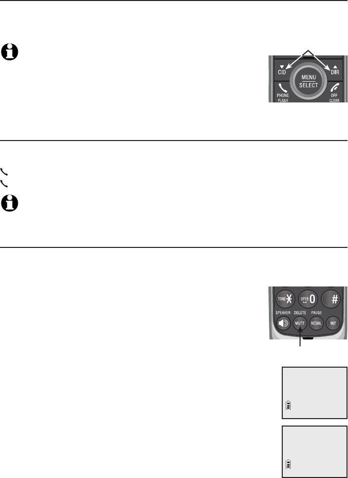 • Press MUTE/DELETE. When mute is on, the handset