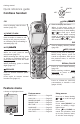 Getting started UP Quick reference guide Cordless handset LEFT CENTER RIGHT DOWN CID MENU������� /������ SELECT Press to display the menu. When in the menu, press to select an item or save an entry or setting. Press up or down NavKey or to scroll up or down while in menus. While entering names or numbers, press left or right NavKey or to move the cursor to the left or right. Press to display caller ID information (page 36). PHONE/FLASH Press to make or answer a call.
