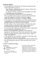 General Safety • • • • • • • • • • • This appliance is intended to be used in household and similar applications such as: – farm houses; staff kitchen areas in shops, offices and other working environments; – by clients in hotels, motels, bed & breakfast and other residential type environments. Do not change the specification of this appliance. The operating water pressure (minimum and maximum) must be between 0.5 (0.05) / 8 (0.8) bar (MPa) Obey the maximum number of 12 place settings.