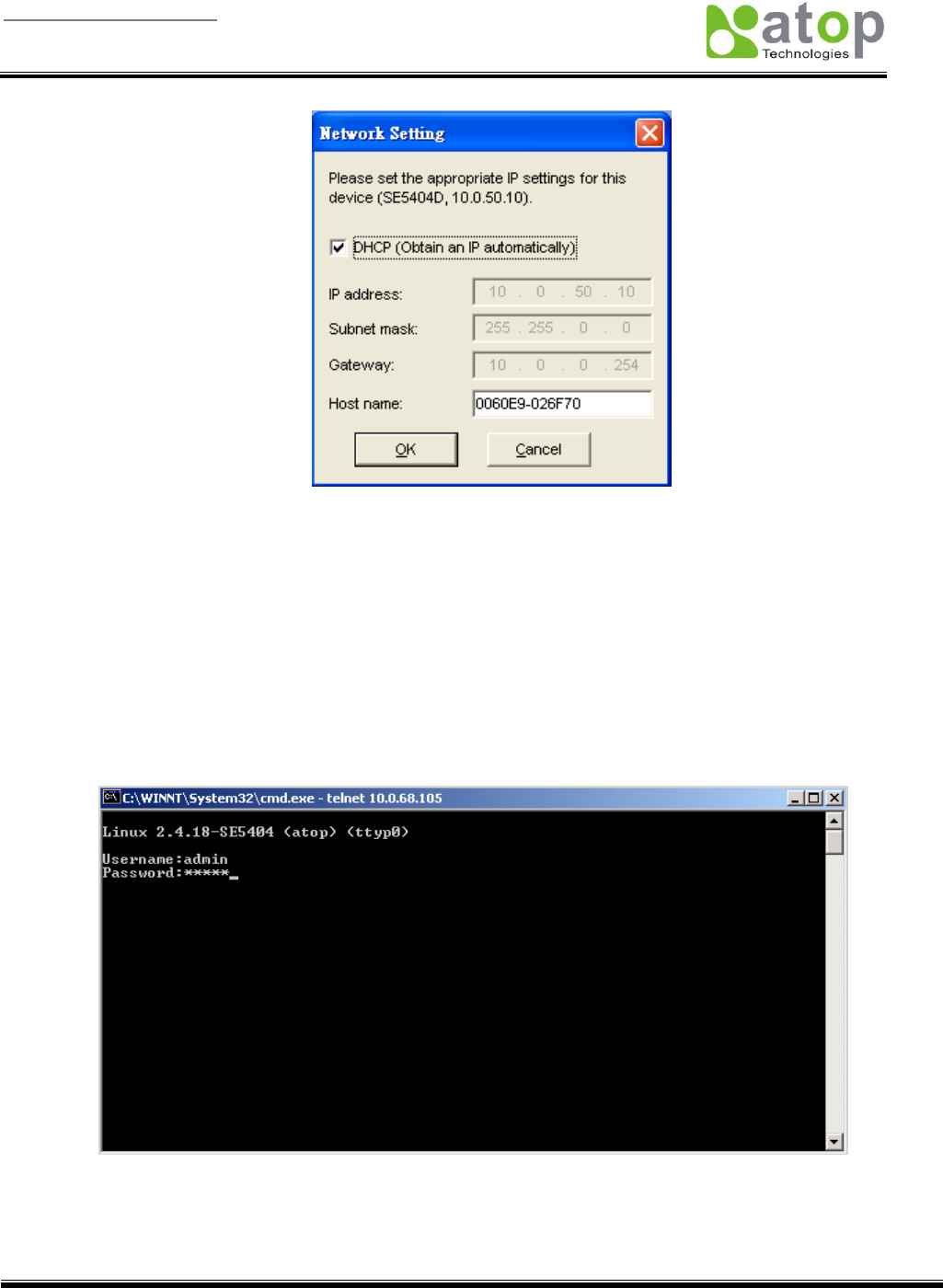 Enter the “Telnet IP_address” (For example, Telnet 10.0.50.100). The system will prompts for a user and