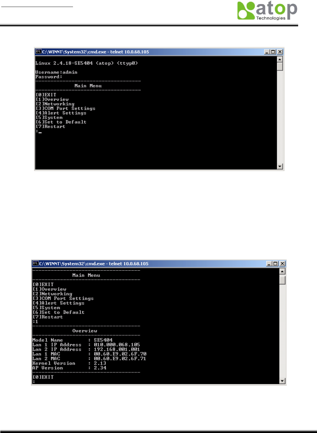 Note: If the Serial Server does not receive any command within 3 minutes, Telnet will be