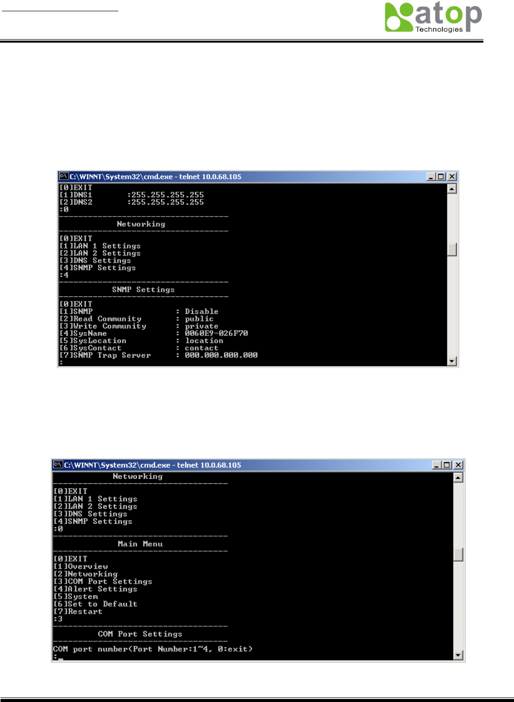 Serial Server allows the user to Enable or Disable the SNMP function by choose the “[4] SNMP: Disable” and