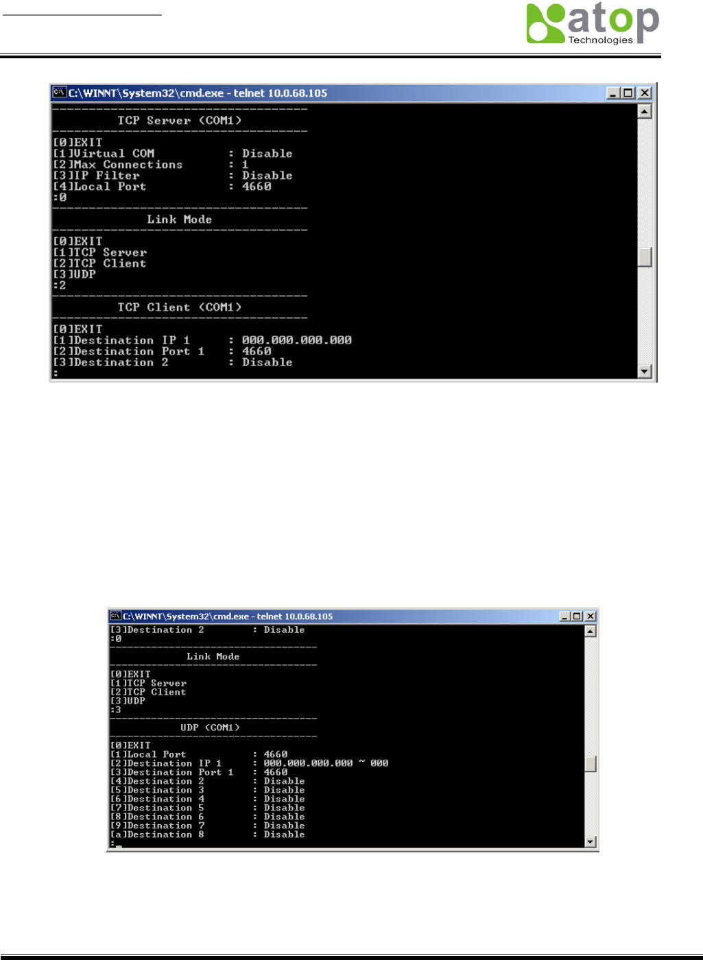 Operation: Main [3]COM Port Setting[1-16]Select Port[1]Link Mode[3]UDP