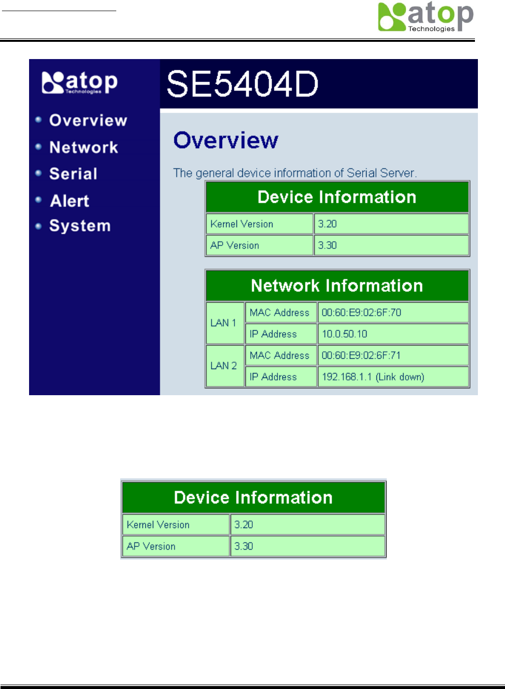 SE5404D Serial Server’s displays system information Kernel version and AP version. The information are read only