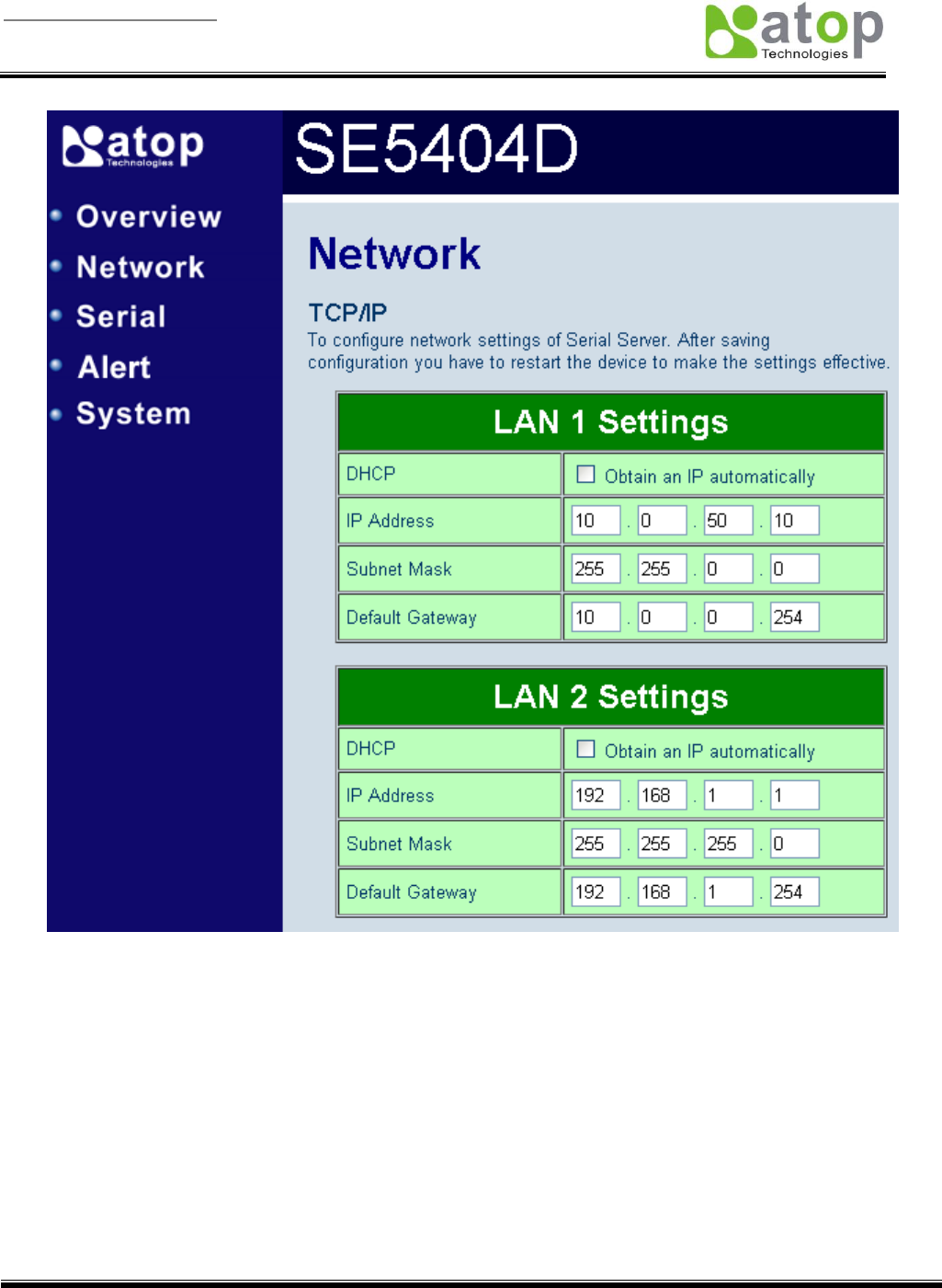 Click on the “Network” link and the following screen shall appear. Fill in LAN 1 IP information on LAN 1 TCP/IP field.