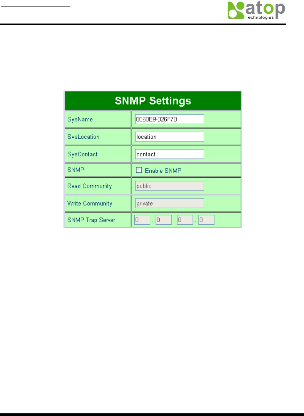 SNMP” field. Fill in Read Community, Write Community, SNMP Trap Server information on SNMP Settings fields.