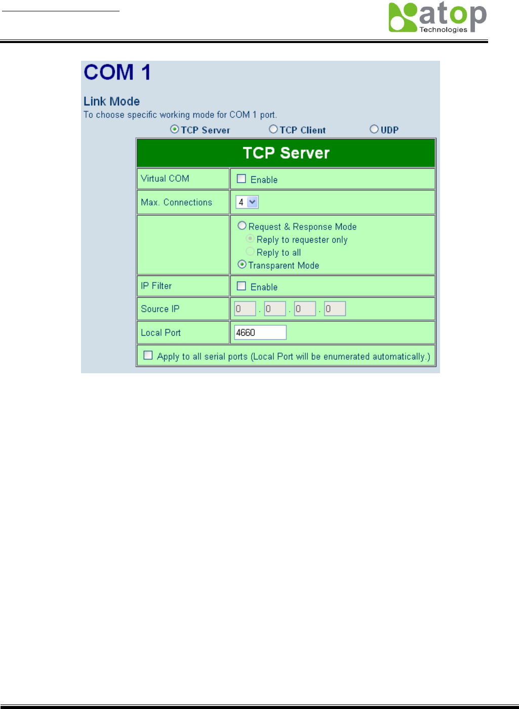 Note: Enable Virtual COM mode if the remote site PC’s “Serial to IP” tool installed