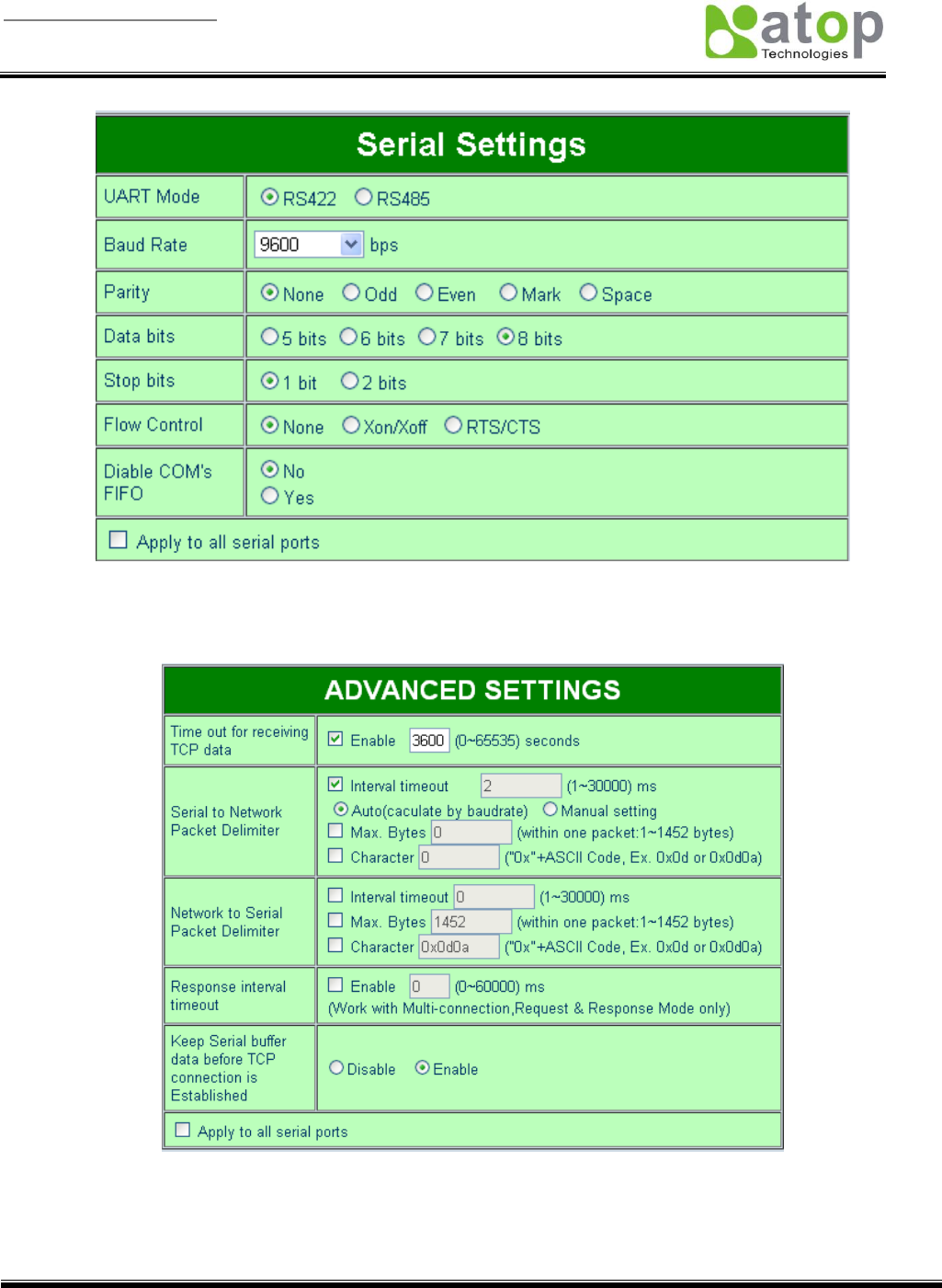 Time out for receiving TCP data (Default: Disabled): This field specifies how long the serial device server