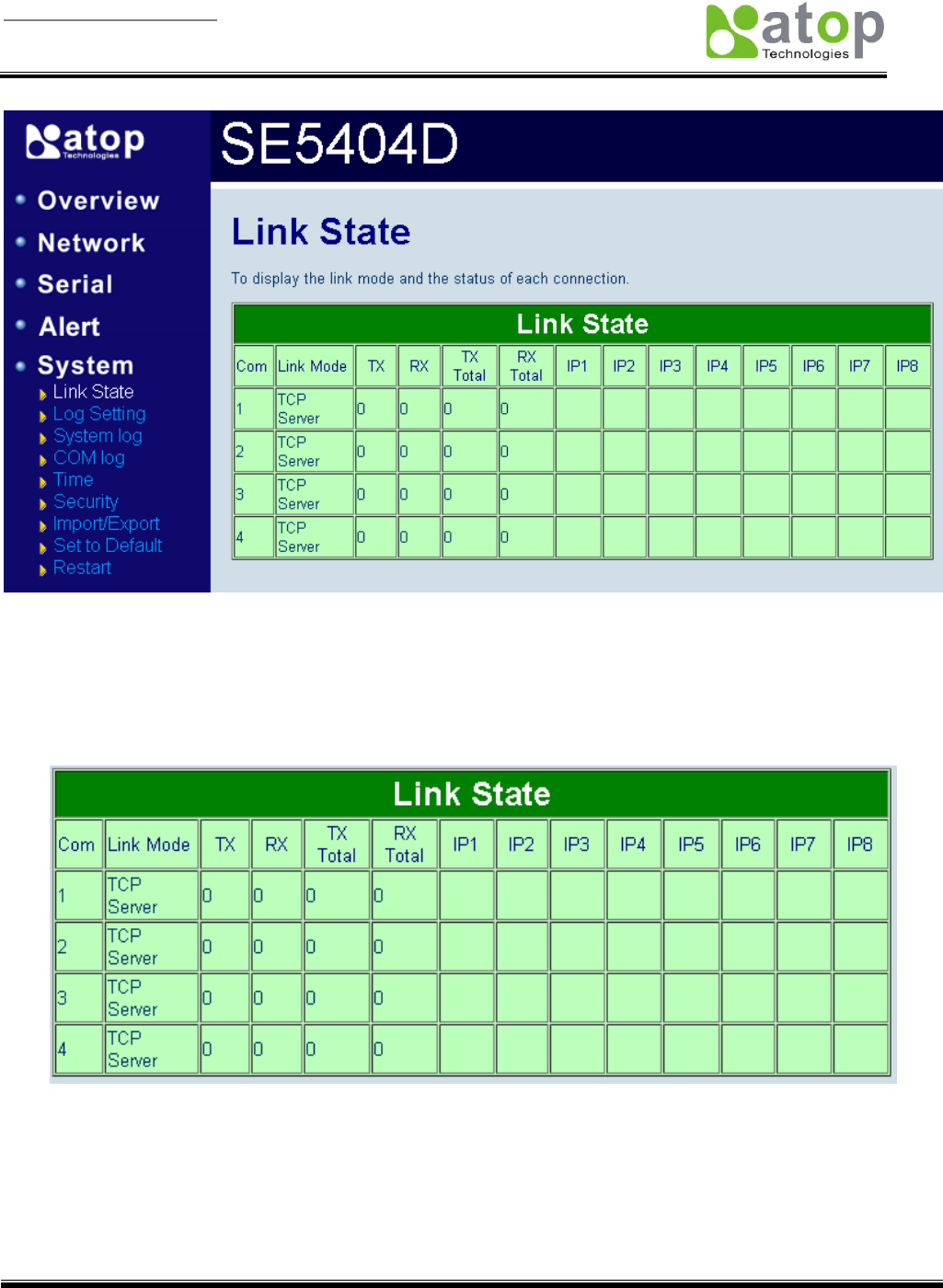 Link State is display information by Link mode (TCP Server, TCP Client and UPD) and status of each connection for
