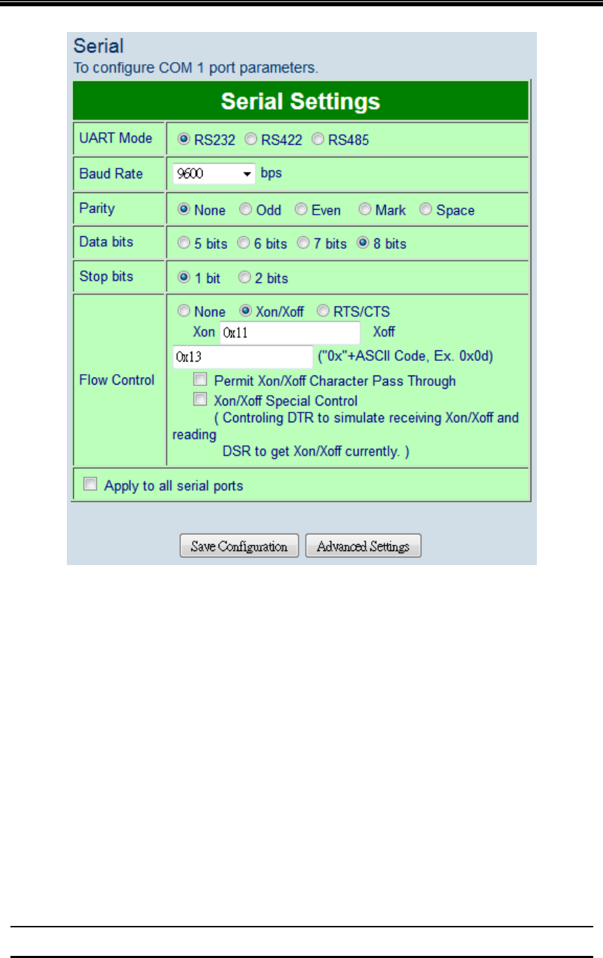 Note: Check “Apply to all serial ports” to execute these settings through all serial ports.