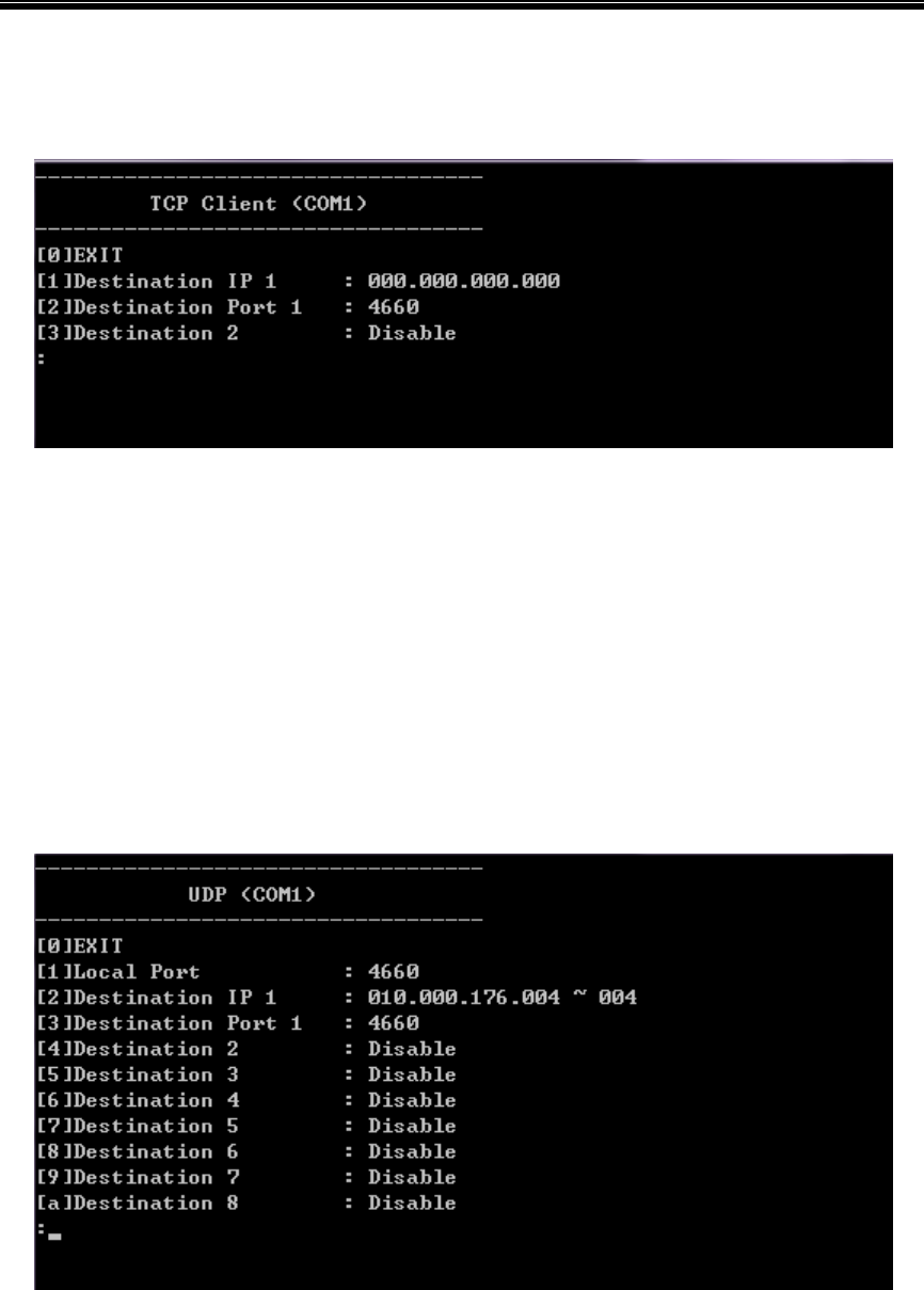 Operation: Main [6]COM Port Setting[1-4]Select Port[1]Link Mode[3]UDP