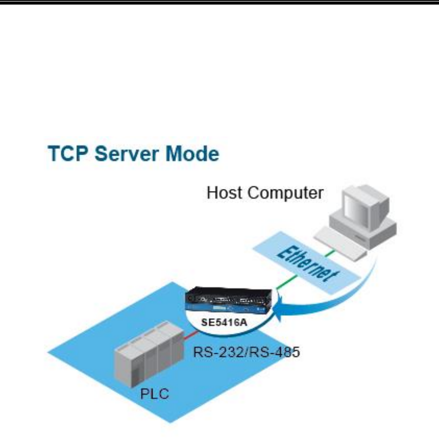 SE5416A Series can be configured as a TCP server in a TCP/IP Network to listen for an
