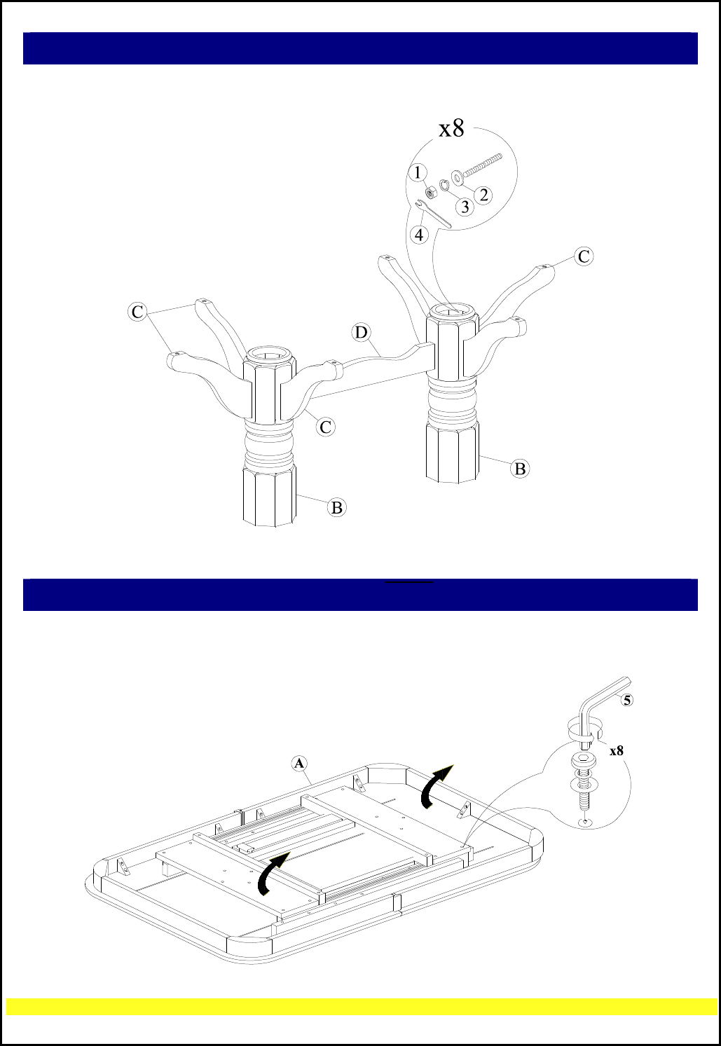 Attach crossbar (D) and legs (C) to pedestals (B) with nuts (1), washers (2) and (3) as shown