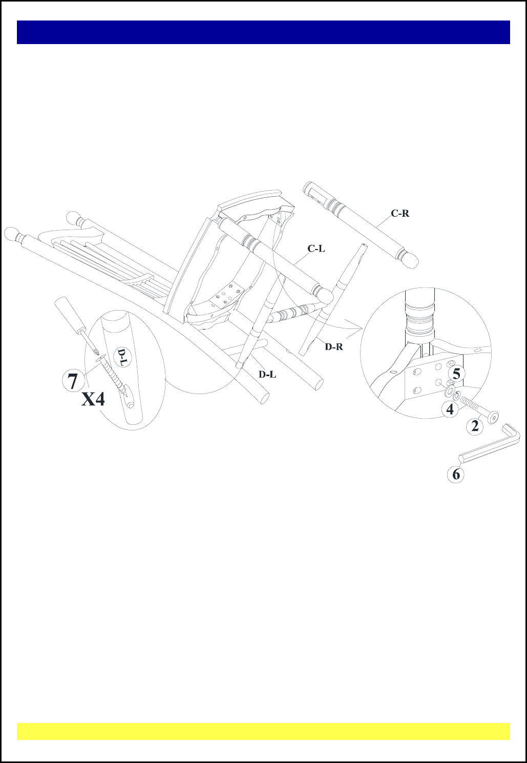 Note: DO NOT tighten any of the bolts, side stretchers (D-L) and (D-R) between front and back legs the