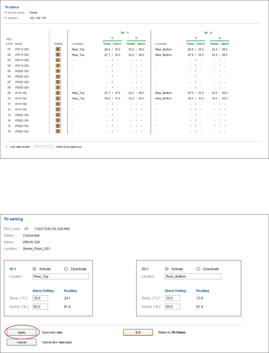 iew status, location, lastest reading & alarm setting of Temp. & Humid sensors connected to each PDU