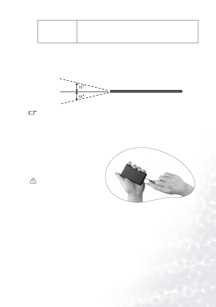The remote control must be held at an angle within 30 degrees of the projector’s IR remote