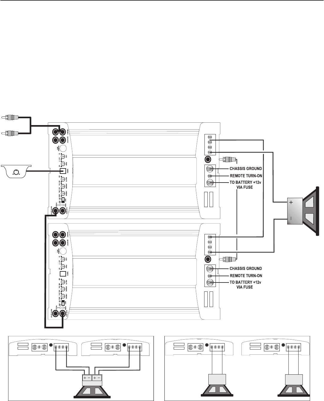 7. Connect the subwoofer(s) in accordance to the diagrams below.