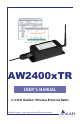 AW2400xTR User’s Manual Thank you for your purchase of the AW2400xTR Outdoor Wireless Ethernet Radio. The AW2400xTR includes: • (1) Radio in weatherproof die-cast aluminum package • (1) AW2-2400 Flexible Antenna • (1) 120 VAC to 12 VDC power adapter • (1) AW-POE Power Over Ethernet Injector If you have any questions when configuring your AvaLAN system, the best place to get answers is to visit www.avalanwireless.com. You will also find the latest updates there.