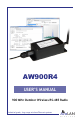 User’s Manual AW900R4 Operational summary The AW900R4 Outdoor Wireless RS-485 Radio is designed for indoor or outdoor use, packaged in a weatherproof die-cast aluminum enclosure with gasketed cover and connectors that meets the IP66 Standard for water and dust resistance. It may be used with all of AvaLAN’s 900 MHz antennas and other accessories such as lightning arrestors and pole-mount brackets.