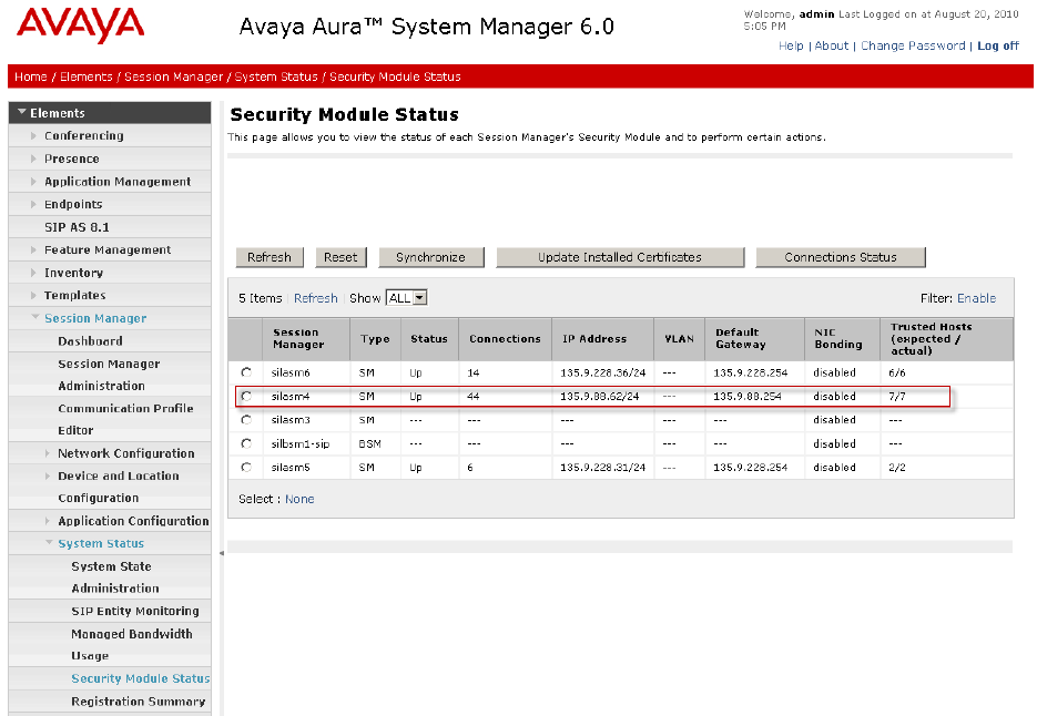Navigate to Elements Session Manager System Status Security Module Status to